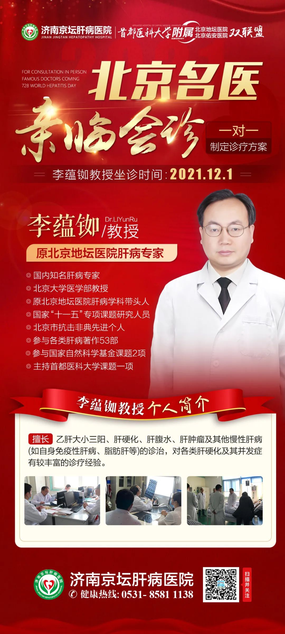 值此活动期间,我院邀请北京肝病专家、医学博士李蕴铷教授坐诊我院,为齐鲁肝病患者一对一制定针对性诊疗方案,帮更多肝病患者走出病痛、重获健康,坐诊时间为12月1日,名额有限,建议提前咨询预约 !