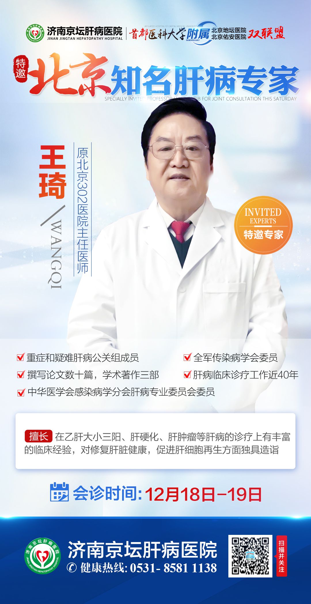 值此活动期间,我院邀请北京专家王琦教授坐诊我院,为齐鲁肝病患者一对一制定针对性诊疗方案,帮更多肝病患者走出病痛、重获健康,坐诊时间为12月18日-19日(本周六、周日),名额有限,建议提前咨询预约 !