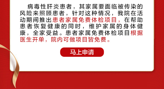 活动期间,来院患者享有多项大型援助项目:肝病检查0元、京鲁医生联合会诊0元、治疗援助最高10000元、住院援助最高5000元、学生免费领取抗病毒药物、患者家属免费体检。